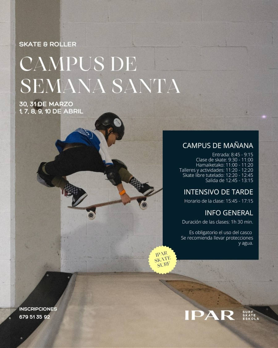 Las actividades se desarrollarán los días: 30 y 31 de marzo y los días 1, 7, 8, 9 y 10 de abril, en el Skatepark cubierto de Ipar en Eibar. Serán de mañana y tarde en los horarios indicados en los cuadros. Las plazas son limitadas, es obligatorio el uso del casco y se recomienda traer protecciones. ¡Inscríbete antes de que se agoten las plazas!